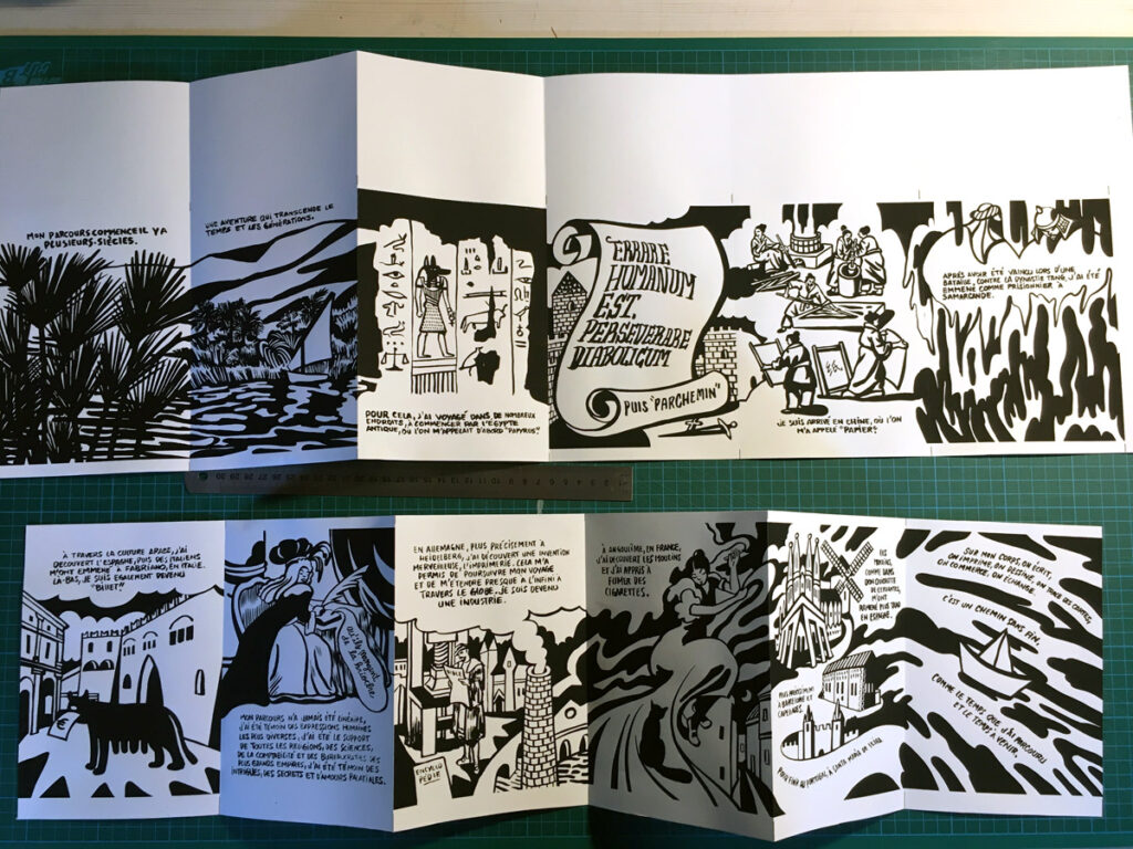 Dévoilé au Pavillon UNESCO pendant le Grand Off de la bande dessinée d’Angoulême, le « leporello » signé par l’artiste argentine Nacha Vollenweider nous invite à un voyage graphique et onirique dans l’Europe de la tradition papetière à travers 12 volets de l’Antiquité à nos jours.